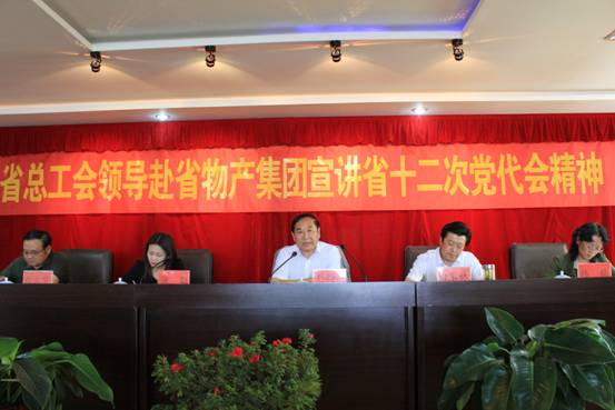 7月2日下午,省總工會(huì)巡視員、經(jīng)費(fèi)審查委員會(huì)主任劉西昆、經(jīng)審辦蒲勤主任、女工部韓梅部長(zhǎng)、重工機(jī)械輕紡工會(huì)白立賢副主席一行4人來物產(chǎn)集團(tuán)宣講省十二次黨代會(huì)精神。集團(tuán)黨委書記、工會(huì)主席白家林同志主持宣講報(bào)告會(huì),集團(tuán)兩級(jí)工會(huì)主席、委員40余人參加宣講報(bào)告會(huì)。